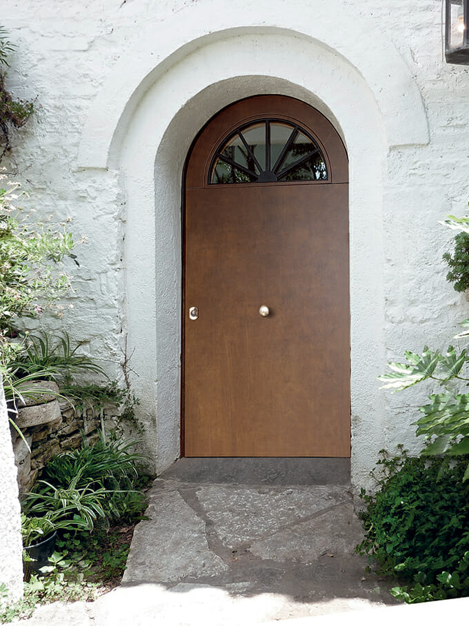 Pannello liscio in okoumè 82 da 16mm, vetro trasparente con grata a raggiera RAL 9005. Pomolo fisso ottone lucido.