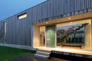 Pannello esterno liscio Laminam Ossido Verderame a lastra unica, da 7mm. Maniglia fissa esterna incassata con placca completa di defender a filo, effetto alluminio (tipo Intro).