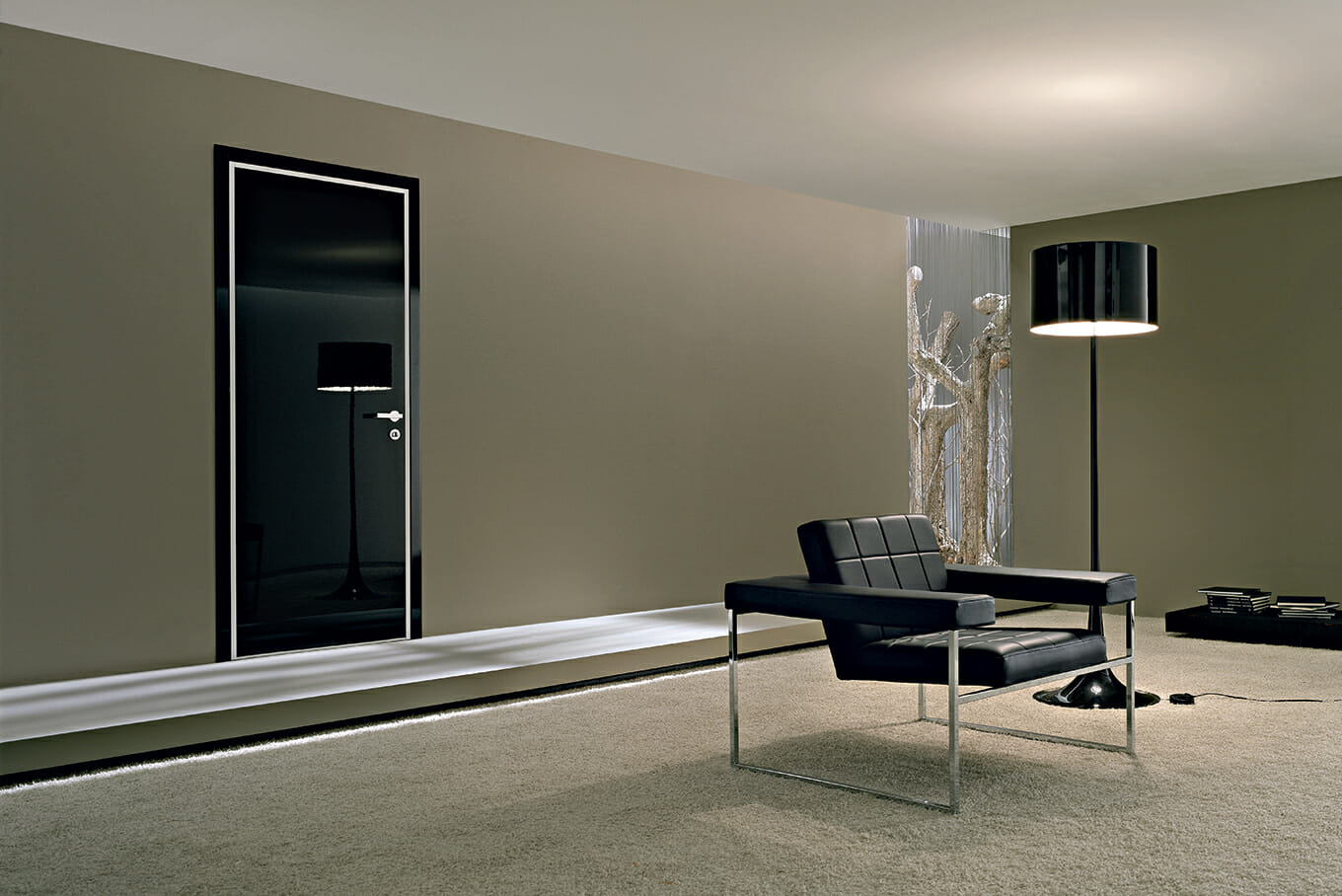 Glossy lacquered smooth MDF panel, RAL 9005, 7 mm, wood trims. Handle H3, polished chrome.