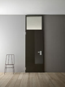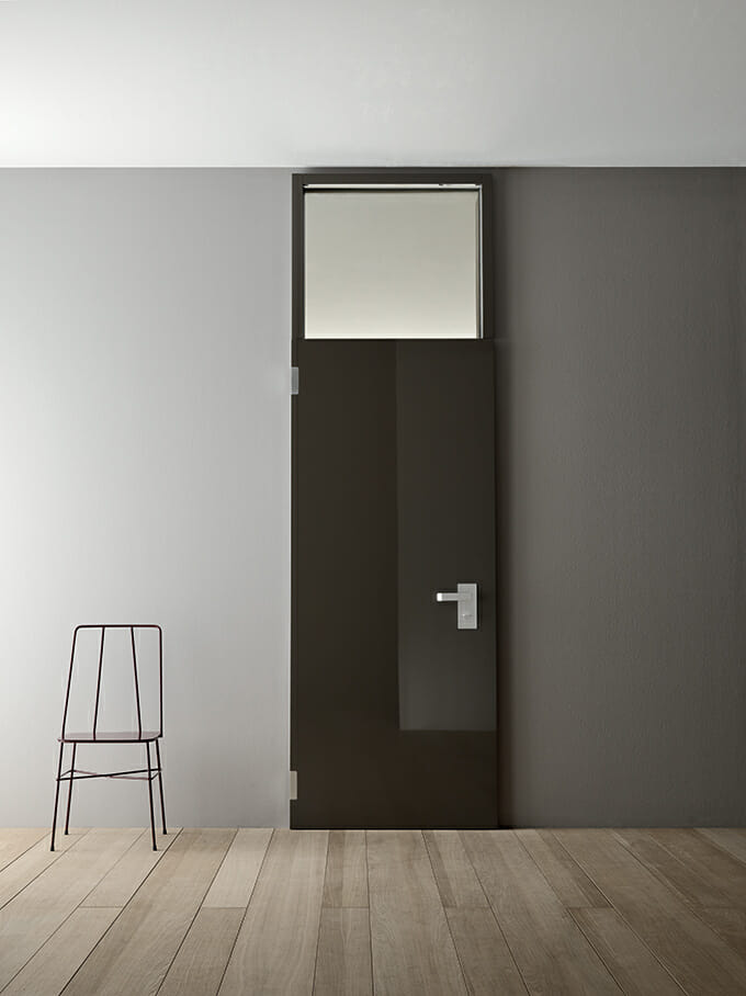 Glossy lacquered smooth MDF panel, RAL D 060.40.05 (river silt), 25 mm, clear glass. Aluminium effect handle.