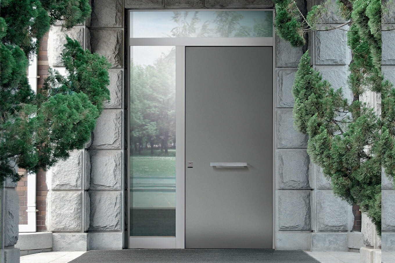 Smooth panel, clad with Laminam Collection Fumo, 7 mm, wood trims clad with Oxy plate, bronze Stopsol glazing. Satin steel fixed handle