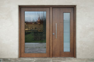 Okume 82 panels, engraved to drawing, 16 mm, wood trims, leaf glazing sandblasted to drawing, and clear sidelight glazing. Satin steel fixed handle bar M6 and square satin chrome defender.