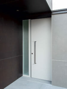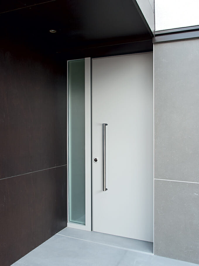 Tablero y revestimientos laterales lisos de okoumé lacado RAL 9016 de 16 mm, vidrio satinado blanco. Manilla grande M1 acero satinado.