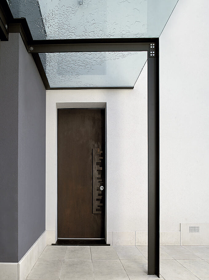 Tablero liso revestido con chapa de acero Corten, 7 mm. Manilla grande fija especial de Corten.