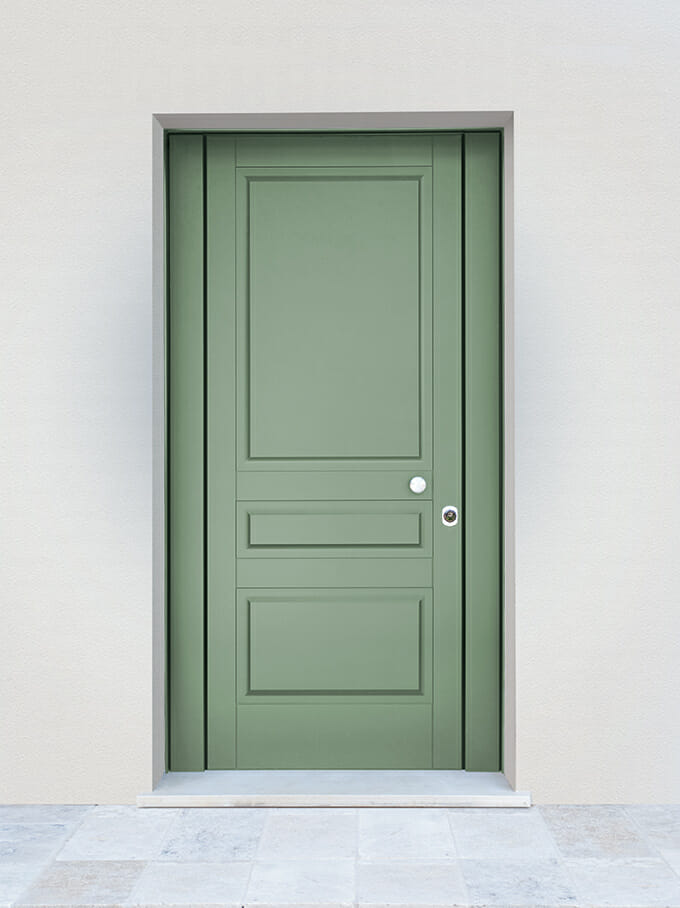 Tablero pantografiado línea Face cód. 3400 de MDF lacado RAL 6021 de 16 mm. Pomo fijo cromo satinado.
