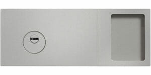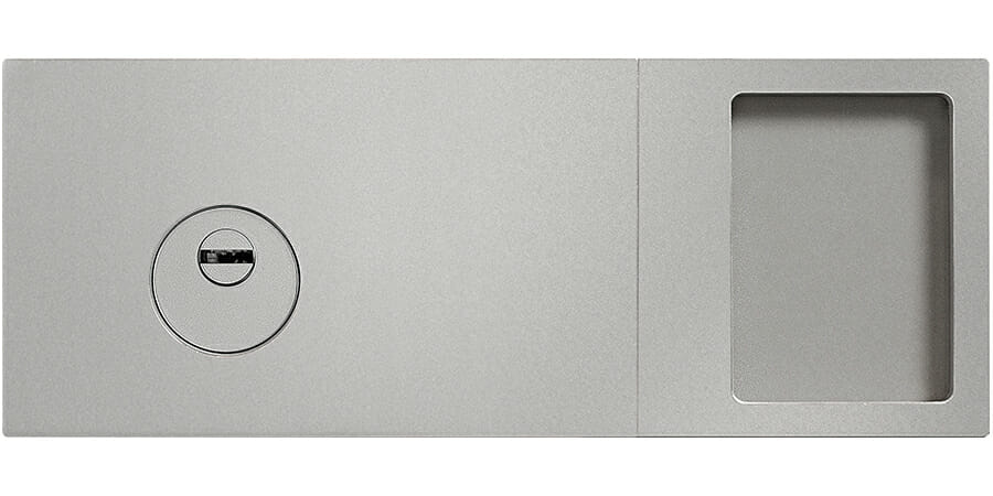 Poignée extérieure fixe, spécifique pour ce modèle, encastrée sur le panneau, laquée finition aluminium.