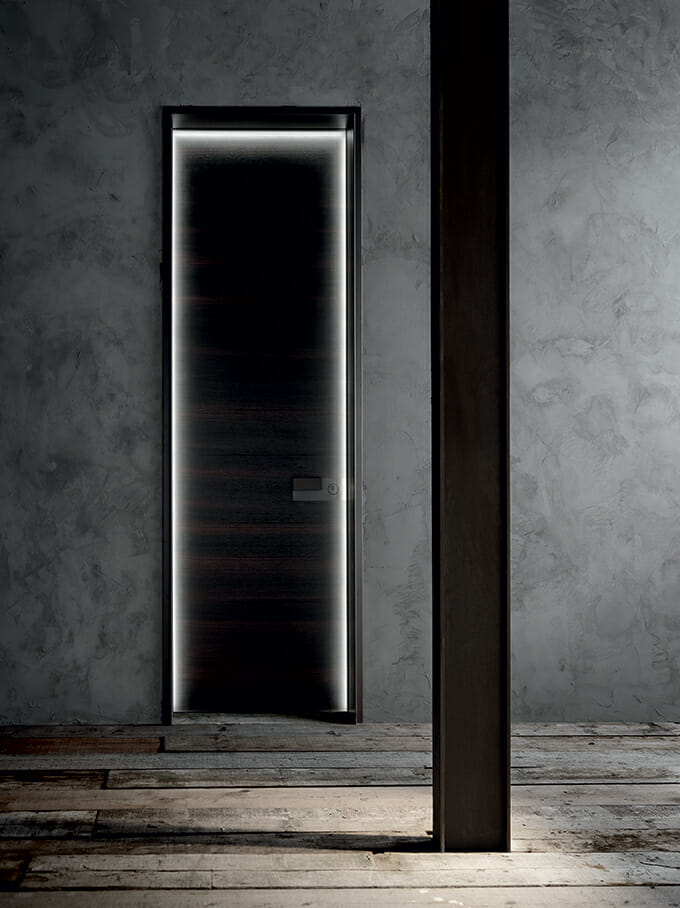 Panneau lisse en chêne thermo- traité avec veine horizontale de 7 mm. Poignée fixe et intrados en aluminium finition brown, avec périmètre lumineux à LED, (typologie application D).