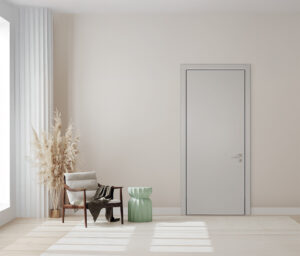 Pannello interno liscio laccato opaco Luna Grigio Soft NCS S 6502-B50G, da 7mm. Maniglia interna G2 cromo satinato.