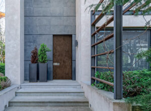 Pannello esterno liscio Laminam Oxide Moro a lastra unica, da 7mm. Maniglia fissa esterna incassata con placca completa di defender a filo, effetto alluminio (tipo