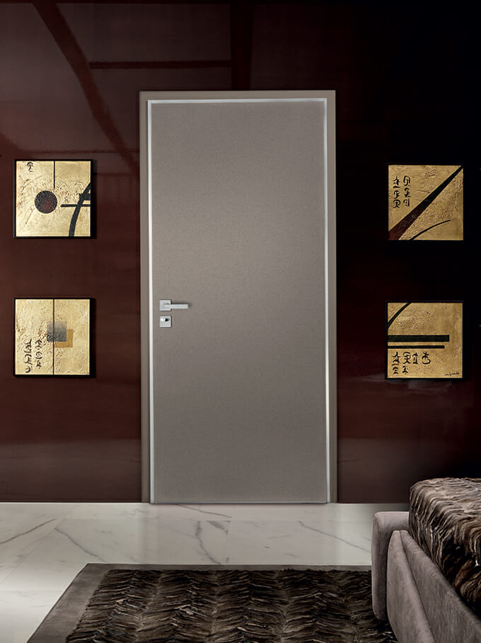 Pannello liscio rivestito con Laminam Fokos Terra, 7mm., angolari in alluminio, telaio RAL 1019.