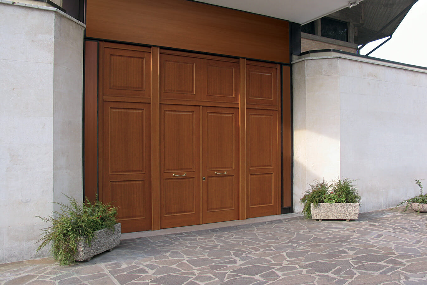 Pannelli bugnati linea Frame cod. 1806 in iroko tinto a campione da 16mm, con coprifili in legno. Doppio maniglione fisso M11 ottone lucido.