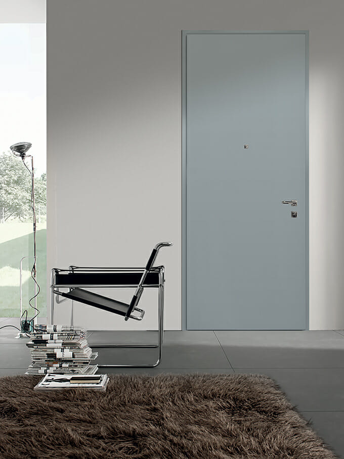 16 毫米中密度板光面门板,RAL 7040 亮光漆,卷边,RAL 7040 门 框。G7 镀铬磨砂把手。
